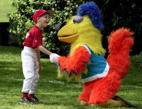 Daniel Allen is congratulated by the San Diego Chicken after catching a fly ball during the first T-Ball game played at the White House on the South Lawn