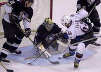 Capitals Jaromir Jagr makes a shot on goal against Penguins goalie Johan Hedberg