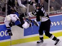 Penguins John Jakopin checks Capitals Chris Simon into the boards